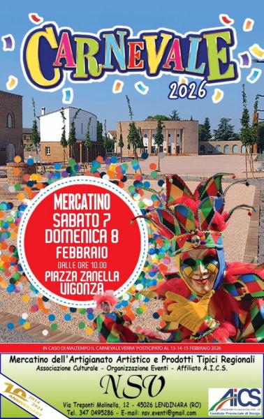 L'Associazione Culturale NSV Organizzazione Eventi APS affiliata A.I.C.S. - Comitato Provinciale di Rovigo, sarà presente in occasione del "Carnevale 2026" nelle giornate di Sabato 07 e Domenica 08 Febbraio 2026, a Vigonza (PD), in Piazza Enrico Zanella, dalle ore 10:00 alle ore 19:00 con il Mercatino delle Tradizioni Popolari, dell'Artigianato Artistico e delle Opere d'Ingegno Creativo con curiose ed originali Idee Regalo per la Casa ed il Tempo Libero con dimostrazioni pratiche delle tecniche di lavorazione sul posto, la rassegna dei Prodotti Enogastronomici Tipici Regionali ed Italiani con Degustazioni e Specialità Alimentari Dolci e Salate Stagionali prodotti artigianalmente per esaltare i Gusti e i Sapori di una tradizione antica ormai persa. Non mancheranno Stand dedicati alla Salute Naturale con Prodotti, Rimedi e Servizi che favoriscono il Benessere, la Cura del Corpo e il Vivere Sano in modo armonioso e sostenibile.