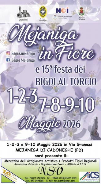 L'Associazione Culturale NSV Organizzazione Eventi APS affiliata A.I.C.S. - Comitato Provinciale di Rovigo, sarà presente in occasione della Manifestazione "Mejaniga in Fiore" nelle giornate di Venerdì 01; Sabato 02; Domenica 03 e Sabato 09; Domenica 10 Maggio 2026, a Mejaniga di Cadoneghe (PD), nelle Piazzette antistanti al Patronato della Parrocchia di Sant'Antonino in Via Gramsci, con la Mostra-Mercato del Florovivaismo con Idee, Prodotti, Attrezzature, Piante e Fiori per l'Appartamento ed il Giardino; ci sarà inoltre la presenza del Mercatino delle Tradizioni Popolari, dell'Artigianato Artistico e delle Opere d'Ingegno Creativo con curiose ed originali Idee Regalo per la Casa ed il Tempo Libero con dimostrazioni pratiche delle tecniche di lavorazione sul posto; la rassegna dei Prodotti Enogastronomici Tipici Regionali ed Italiani con Degustazioni e Specialità Alimentari Dolci e Salate Stagionali prodotti artigianalmente per esaltare i Gusti e i Sapori di una tradizione antica ormai persa. Non mancheranno Stand dedicati alla Salute Naturale con Prodotti, Rimedi e Servizi che favoriscono il Benessere, la Cura del Corpo e il Vivere Sano in modo armonioso e sostenibile.